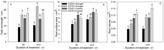 Effects of drought and re-watering on the total root length (A), root surface area (B), and root volume (C) in centipedegrass. ‘CG021’ and ‘CG101’ are the drought-sensitive genotype and drought-tolerant genotype, respectively. ‘Drought’ represents the drought treatment. ‘Control’ represents the well-watered treatment. ‘re’ represents the re-watering treatment. Different letters indicate the significant difference (p ≤ 0.05) between different treatments on a certain day. Error bars indicate the standard error (SE).