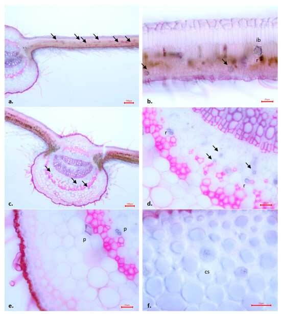 Transverse section of leaf laminas of Salix triandra × S. viminalis ‘Inger’. Different types of Ca-oxalate crystals: Ca-oxalate crystal rosette (r) is a typical characteristic of the leaf mesophyll but can also be found in the mesophyll cells of the midrib area (black arrows). Surrounding the midrib are the Ca-oxalate pyramids (p) and crystal sand (cs). The idioblast cells (ib) can be typical in the leaf mesophyll. (a) Cross-section of the leaf—WA (4×), (b) leaf mesophyll—Control (20×), (c) cross-section of the leaf—Control (4×), (d) Ca-oxalate crystal rosettes in the midrib of mesophyll cells—Control (20×), (e) Ca-oxalate pyramids in the midrib of mesophyll cells—Control (20×), (f) Crystal sand in the midrib of mesophyll cells—Control (40×). WA = wood ash. Scale bars: (a) 100 μm, (b) 25 μm, (c) 100 μm, (d) 25 μm, (e) 25 μm, (f) 25 μm.