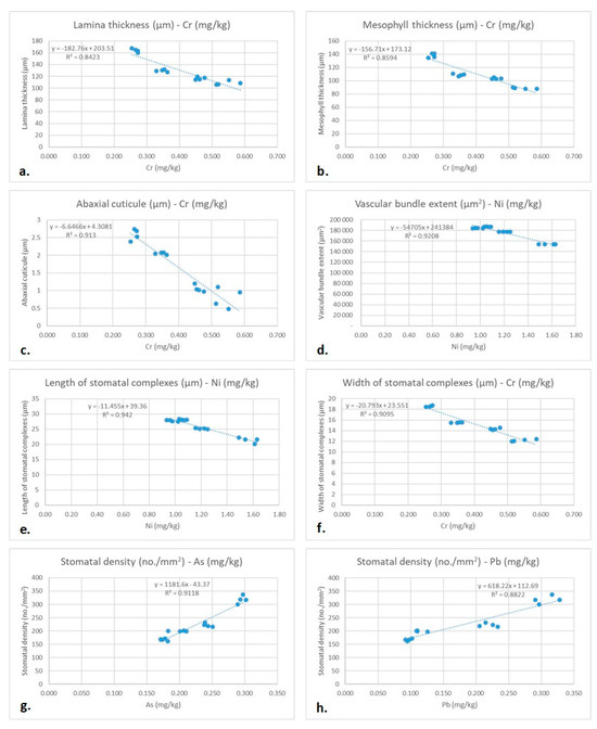 Linear regression analysis between PTE concentrations and micromorphological parameters. (the regression line, regression function, and the value of regression coefficient). (a) The relationship between Cr concentration (mg/kg) and lamina thickness (μm), (b) The relationship between Cr concentration (mg/kg) and mesophyll thickness (μm), (c) The relationship between Cr concentration (mg/kg) and abaxial cuticule thickness (μm), (d) The relationship between Ni concentration (mg/kg) and vascular bundle extent (μm2), (e) The relationship between Ni concentration (mg/kg) and length of stomatal complexes (μm), (f) The relationship between Cr concentration (mg/kg) and width of stomatal complexes (μm), (g) The relationship between As concentration (mg/kg) and stomatal density (no./mm2), (h) The relationship between Pb concentration (mg/kg) and stomatal density (no./mm2).