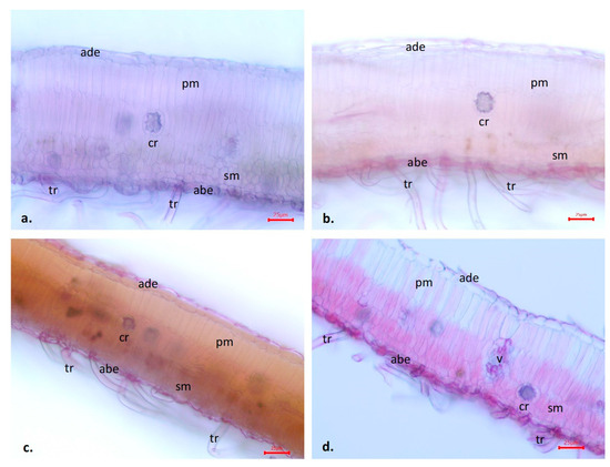 Transverse section of leaf laminas of Salix triandra × S. viminalis ‘Inger’. Effects of soil treatments on the anatomical characteristics of the leaf lamina. (a) Control (20×), (b) WA (20×), (c) MSSC + MSS (20×), (d) MSSC + MSS + WA (20×). MSSC = municipal sewage sludge compost. MSS = municipal sewage sediment. WA = wood ash. ade: adaxial epidermis, abe: abaxial epidermis, pm: palisade mesophyll, sm: spongy mesophyll, v: vein, cr: Ca-oxalate crystal rosette, tr: trichomes. Scale bars: 25 μm.