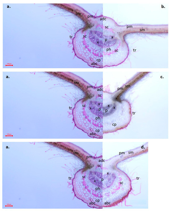 Transverse section of leaf laminas of Salix triandra × S. viminalis ‘Inger’. Effects of soil treatments on the anatomical characteristics of the midrib I. (a) Control (4×), (b) WA (4×), (c) MSSC + MSS (4×), (d) MSSC + MSS + WA (4×). MSSC = municipal sewage sludge compost. MSS = municipal sewage sediment. WA = wood ash. adc: adaxial collenchyma, abc: abaxial collenchyma, p: pith, ph: phloem, x: xylem, cp: cortical parenchyma, sc: sclerenchyma, pm: palisade mesophyll, sm: spongy mesophyll, tr: trichomes. Scale bars: 100 μm.