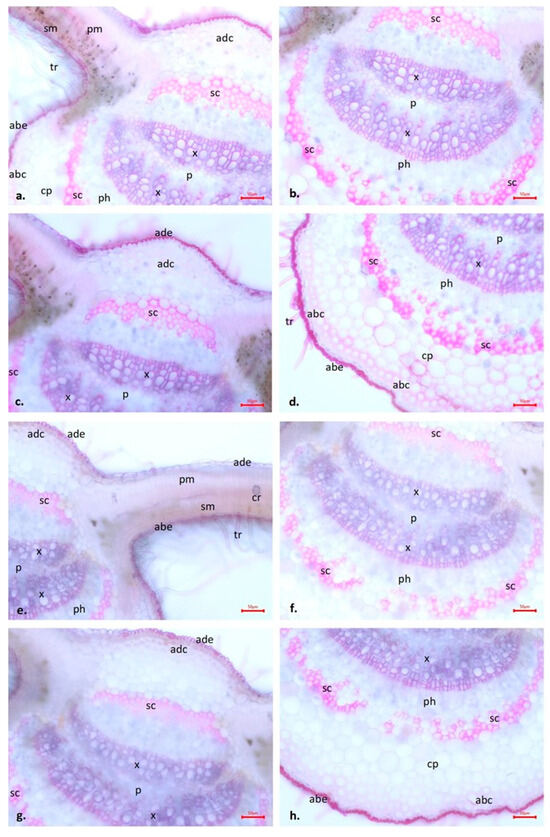 Effects of soil treatments on the anatomical characteristics of the midrib and vascular bundle in the case of the MSSC + MSS- and MSSC + MSS + WA-treated samples. Transverse section of leaf laminas of Salix triandra × S. viminalis ‘Inger’. (a–d) MSSC + MSS ((a,b): 10×, (c,d): 20×), (e–h) MSSC + MSS + WA ((e,f): 10×, (g,h): 20×). MSSC = municipal sewage sludge compost. MSS = municipal sewage sediment. WA = wood ash. ade: adaxial epidermis, abe: abaxial epidermis, adc: adaxial collenchyma, abc: abaxial collenchyma, sc: sclerenchyma, x: xylem, ph: phloem, p: pith, cp: cortical parenchyma, pm: palisade mesophyll, sm: spongy mesophyll, tr: trichomes. Scale bars: 10×: 50 μm, 20×: 25 μm.