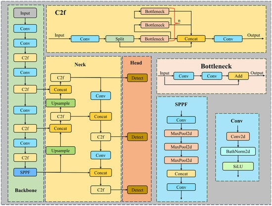 The YOLOv8 algorithm is an innovative single-stage object detection technique, comprising a backbone network, a neck structure, and a detection head [], as illustrated in Figure 2. The backbone network of YOLOv8 has been optimized, building on YOLOv5 and replacing the traditional C3 module with the C2f module. The C2f module synthesizes the Cross Stage Partial Network (CSP) concept and the ELAN module from YOLOv7, thereby enriching the gradient flow information while sustaining the network’s efficient design. Additionally, YOLOv8 retains the SPPF module, which manages targets of different scales through a series of three 5 × 5 max pooling layers, ensuring heightened detection accuracy while maintaining a streamlined network architecture. In the realm of feature fusion, YOLOv8 leverages PAN-FPN to bolster the amalgamation and application of information from feature layers of varying scales, enhancing the model’s proficiency in detecting multi-scale targets. The neck structure of YOLOv8 is constituted by two upsampling layers and an array of C2f modules, culminating in a decoupled head structure that distinguishes classification and regression tasks, thereby amplifying the detection precision.