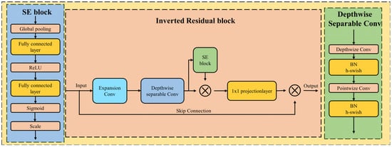 The MobileNetV3 is a lightweight deep learning model introduced by the Google team in 2019, specifically optimized for mobile and embedded devices []. The MobileNetV3 model uses Depthwise Separable Convolution to reduce computational load and model size, while enhancing feature representation with Inverted Residuals that incorporate linear bottleneck structures []. Additionally, MobileNetV3 incorporates the Squeeze-and-Excite (SE) module to strengthen inter-channel relationships and employs a smooth, non-monotonic activation function called h-swish to improve model performance. The Inverted Residual module of the MobileNetV3 network is illustrated in Figure 3. The design of MobileNetV3 was accomplished through Network Architecture Search (NAS) techniques to achieve an optimal network structure. In this study, we chose the Small version of the MobileNetV3 network to suit resource-constrained mobile deployments, with its backbone network structure shown in Figure 4. As depicted in Figure 4, the output stage consists of a Conv_bn_h-swish module composed of Conv2d, BatchNorm2d, and the h-swish activation function, while the remaining stages are Inverted Residual blocks.