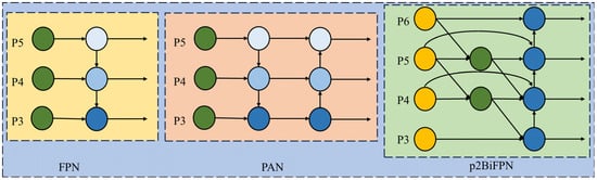 Although the PAN-FPN structure of YOLOv8 enhances the fusion of semantic and localization information, it may lead to information loss when handling large-scale feature maps, affecting detection quality and further reducing feature reuse during upsampling and downsampling processes []. In this study, to improve YOLOv8s ability to detect small objects, especially occluded small objects, we adopted the Bidirectional Feature Pyramid Network (BiFPN) structure and integrated it with a small object detection layer to enhance the neck network of YOLOv8. The BiFPN introduces a bottom-up path to enhance information exchange between different levels of features, thereby providing richer contextual information for small-sized objects. Additionally, BiFPN employs weighted feature fusion technology, dynamically adjusting the weights of features at different scales, allowing the model to focus more on the features that are crucial for the current task. Furthermore, to enhance small object detection performance, we introduced a dedicated small object detection head based on BiFPN. In BiFPN, the feature fusion process can be expressed by the following formula: