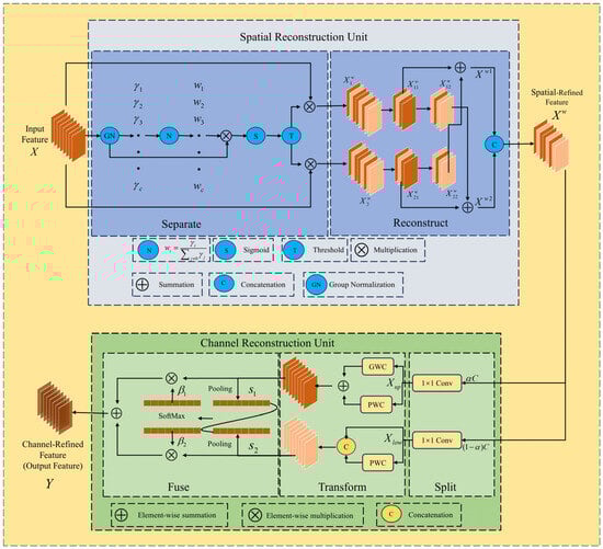 The purpose of the SRU is to reduce spatial redundancy in feature maps through separation and reconstruction operations. It first uses the scaling factors of the Group Normalization layer to evaluate the amount of information in different feature maps. Then, it separates the feature maps with high information content from those with low information content through a gating operation. The SRU further combines these two parts of the feature maps through a cross-reconstruction operation to enhance feature representation and reduce spatial redundancy. The CRU aims to reduce channel redundancy in feature maps. It adopts a Split-Transform-and-Fuse strategy, first dividing the channels of the feature map into two parts, and then using lightweight operations such as 1 × 1 convolution and Group-wise Convolution to extract representative features. Finally, it adaptively merges the feature maps from different transformation stages using a feature importance vector, further reducing channel redundancy.