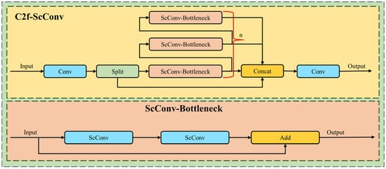 This study employs the ScConv convolution module to replace the convolution in the C2f module, capturing spatial and channel information of the target more effectively during the feature extraction phase, thereby enhancing the performance of the C2f module. The structure of the improved C2f-ScConv module is shown in Figure 7.