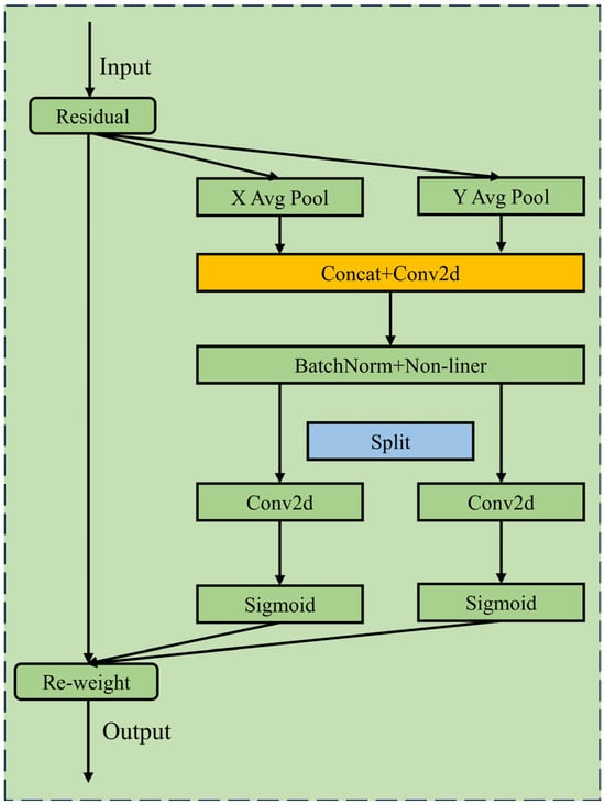 Coordinate Information Embedding: The CA module first encodes spatial information by applying two parallel one-dimensional (1D) convolutions along the horizontal and vertical directions of the input feature map X. This operation generates two direction-aware feature maps, retaining spatial cues critical for target localization. Coordinate Attention Generation: Next, the encoded features are transformed to generate an attention map. This transformation involves concatenating the direction-aware feature maps, and then processing them through a 1 × 1 convolution, batch normalization, and a nonlinear activation function. The output is then split into two separate tensors, each adjusted to match the channel dimensions of the input feature map X. The final attention weights are obtained through a sigmoid function and then applied to the input feature map to produce an enhanced output.