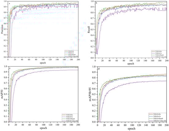 The variation of accuracy of the training process for different models: (a) displays the iterative training accuracy of the model, (b) shows the iterative recall during training, (c) illustrates the mAP50 (mean Average Precision at 50% Intersection over Union) across iterations, and (d) represents the mAP50-95, which measures the model’s performance over a broader range of Intersection over Union thresholds.