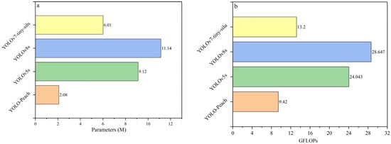 The number of parameters and GFLOPs diagrams for different models: (a) represents the model’s parameter count, and (b) illustrates the model’s GFLOPs.