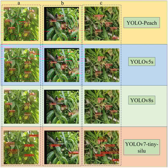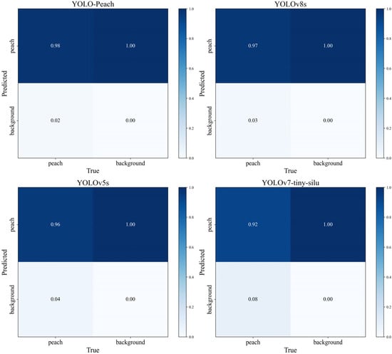 To visually demonstrate the performance of different models, we use confusion matrices and detection results to present the detection performance of different models more intuitively. The regularized confusion matrices and detection results of different models are shown in Figure 12 and Figure 13. From Figure 12, it can be observed that among the regularized confusion matrices of different models, the YOLO-Peach model has the highest proportion of correct detection of peaches, reaching 0.98, indicating the best detection performance. Following that, the YOLOv8s model has a proportion of correct detection of 0.97, indicating relatively good detection performance. The third-ranking model is the YOLOv5 model, with a proportion of correct detection of 0.96, indicating relatively poor detection performance. Lastly, the YOLOv7-tiny-silu model exhibits the poorest detection performance, with a correct detection proportion of 0.92.