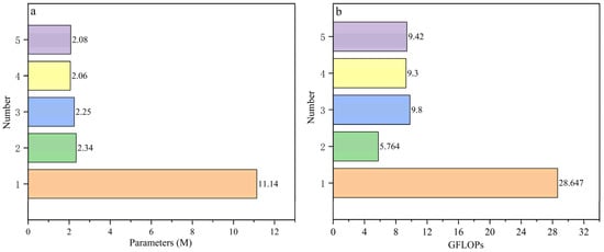 The number of parameters and GFLOPs modeled for ablation experiments: (a) represents the model’s parameter count, and (b) illustrates the model’s GFLOPs.