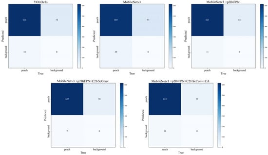 To provide a more direct assessment of the performance across various models, we utilized a confusion matrix to graphically represent the impact of different enhancements on the model’s performance. The outcomes of these confusion matrices are depicted in Figure 15. As illustrated in Figure 15, the integration of MobileNetV3 into the backbone network resulted in a reduction of 11 accurately identified peach saplings and an increase of 19 false identifications of the background. Upon the simultaneous introduction of MobileNetV3 and P2 + BiFPN, the model’s performance showed an improvement over the baseline YOLOv8s model, with an increase of 7 in the number of accurate identifications and a decrease of 13 in the number of false background identifications. Subsequently, by further integrating the ScConv and C2f modules on the foundation of MobileNetV3 and P2 + BiFPN to enhance the model’s precision, there was an increase of 11 in the number of accurate identifications and a decrease of 24 in the number of false background identifications, when compared to the baseline YOLOv8s. Ultimately, the introduction of the CA attention mechanism, despite a slight reduction of 3 in the number of accurate identifications, led to a significant decrease of 11 in the number of false background identifications.