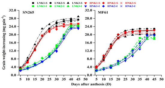 The superior grains of SN265 had the fastest growth rate and the greatest final growth at the LNK3 level, followed by LNK1 and LNK2. The difference in the proportion of K applied before and after the HN treatment had less of an effect on the weight gain of the superior grains, both of which were lower than in the LN treatment. The weight gain pattern of the inferior grains was the same as that of the superior grains, but the difference between the treatments was not significant. The superior grains of MF61 had the largest final weight of seeds at the LNK2 level, but the difference in the growth rate between the different N levels was small, and the pattern of different K application ratios was K2 > K1 > K3. The difference in the inferior grains was more obvious—under the LN treatment they finished grubbing first, whereas under the HN treatment they took longer to grub. Overall, the final growth of SN265 was greater than that of MF61, and the effects of N and K rationing were not consistent for the two cultivars.