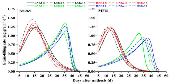 Table 1 lists the grain-filling characteristic parameters of each treatment calculated according to the Richards model, and Figure 2 shows the simulation curve of the grain-filling rate. SN265 had the highest filling rate of superior grains of K3; these were the highest under LN conditions, and its Tmax, D, and T99 were the smallest among all the superior grains of this cultivar, while GRmax, GRmean, and Wmax were the largest. The next was K3 and K2 under HN conditions, and the differences among the other treatments were small. For K1 under LN conditions, both cultivars had the largest Tmax, but T99 was smaller, indicating that grain-filling was slower in the early stage and faster in the later stage. Among the inferior grains, LNK1 had the largest GRmax, followed by HNK2 (mean value of the two cultivars), and the difference between the other treatments was small. The GRmax, GRmean, and other indices of the superior grain-filling rate in MF61 showed little difference, while R0 and I had large differences in their values. It is noteworthy that the grain-filling rate curves of the inferior grains of LNK1 and HNK1 (mean value of the two cultivars) were different from those of other treatments. The Tmax of LNK1 was the smallest, GRmax and GRmean were the largest, and Tmax and T99 of HNK1 were the largest. In general, the grain-filling rate under LN and HN conditions had its advantages and disadvantages, and the indices of SN265 were better than those of MF61. With the increase in the proportion of K fertilizer applied before and after N treatment, the filling rate of inferior grains of SN265 increased, while that of MF61 decreased. The grain-filling rates of the two cultivars were not significantly different under different N levels.