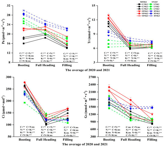 The regularity of cultivars and N application at the filling stage was consistent with that at the full head stage. However, the pattern of K fertilizer operation was different from that of the previous two periods. Only the difference in Tr reached a very significant level, while all other photosynthetic rate indices were not significant. The reason for this is that MF61 under HN conditions presents the opposite situation to the overall pattern, which is more influential than the full head stage. However, this phenomenon requires further exploration.