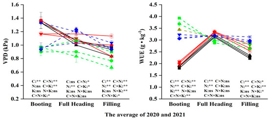 At the full heading stage, Pn and Tr of SN265 were significantly higher than those of MF61 by 8.39 and 14.16%, respectively, and Ci and WUE were significantly lower than those of MF61 by 8.11 and 5.25%, respectively. Under HN conditions, the pattern was the same as that at the full heading stage, except for WUE. Excepting WUE, the pattern of K operation was the same as that at the booting stage. However, it is noteworthy that the pattern of K operation under HN of MF61 was contrary to the overall pattern. In this period, an increase in N fertilizer increased Pn, Tr, Ci, and Gs of different cultivars by 4.09–20.48%, and K3 increased Pn, Tr, Ci, and VPD by 3.91–32.50%. The interaction of Pn, Ci, and VPD indicators between cultivars and N application reached significant levels; the interaction between Pn, Tr, Ci, Gs, and VPD indicators, cultivars, and K application reached a significant level; the interaction between Pn, Tr, Ci, and Gs and N and K allocation reached a significant level; and the three-factor interaction between Pn and Gs reached a significant level.