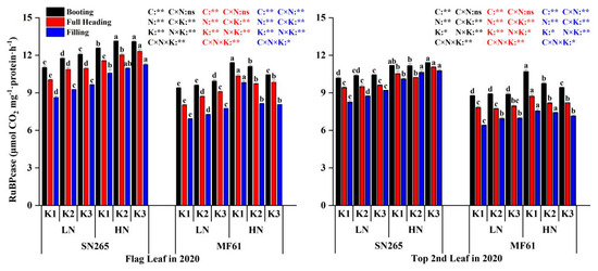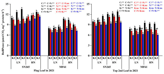 Results of the three-way ANOVA on N- and K-rationing effects on the activity of RuBPcase of different cultivars at different periods in 2020 and 2021. Note: Different lowercase letters indicate significant differences between groups of the two factors (p < 0.05); * and ** indicate significant differences at the 0.05 and 0.01 levels, respectively, and ns indicates non-significant differences; C: cultivars, N: nitrogen treatment, K: potassium treatment. K fertilizer pre- and post-application ratio of 3:7 under low N conditions (LNK1); K fertilizer pre- and post-application ratio of 5:5 under low N conditions (LNK2); K fertilizer pre- and post-application ratio of 7:3 under low N conditions (LNK3); K fertilizer pre- and post- application ratio of 3:7 under high N conditions (HNK1); K fertilizer pre- and post-application ratio of 5:5 under high N conditions (HNK2); and K fertilizer pre- and post-application ratio of 7:3 under high N conditions (HNK3).