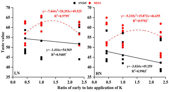 The relationship between N and K rationing and the taste value of two cultivars is shown in Figure 5. The dietary value of SN265 was negatively correlated with the ratio of K pre-application, that is, the higher the K application in the early stage, the lower the dietary value. However, under the LN condition, the taste value decreased slightly, and the fitting equation was y = −1.416x + 54.969. Under HN, it decreased significantly, and the fitting equation was y = −3.034x + 49.259. The fitting equations were all linear with one variable, and R2 reached a significant level. The taste value of MF61 with increasing K fertilizer pre-application ratio showed a trend of first increasing and then decreasing, that is, with the ratio increase of K fertilizer application in the early stage, the taste value increased, and then began to decline after reaching the optimal ratio. Under LN, the optimal ratio before and after K fertilizer application was <6:4, whereas under HN, the optimal ratio was >6:4, and the peak value of taste showed an obvious backward shift. The fitting equation for the LN condition was y = −7.444x2 + 20.353x + 49.525, R2 = 0.9799, and the highest value of tasting appeared at 63.44 when the K fertilizer pre-application ratio was 1.37. Under the HN condition, the fitting equation was y = −5.210x2 + 15.872x + 46.622, R2 = 0.9702. The highest taste value appeared at 58.74 when the K fertilizer pre-application ratio was 1.52.