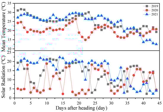 Everyday mean air temperature and solar radiation during 44 days after full heading stage in 2019, 2020, and 2021.