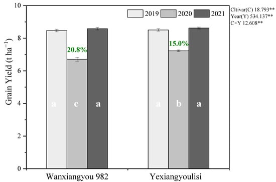 Average rice grain yield (2019, 2020, and 2021) as affected by cultivar and year (n = 3). ** significant at 0.01 probability level. Vertical bars represent standard error of the mean. Bars labeled with different lowercase letters indicate statistically significant differences (p < 0.05) between interannual climate variation within the same cultivar.