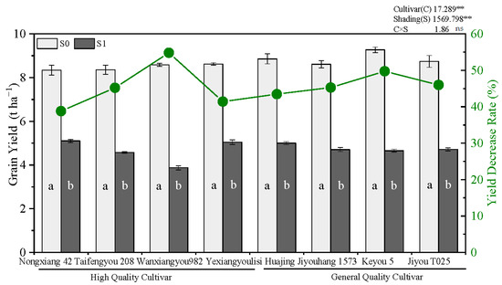 The mean daily temperature in 2021 was 24.6 °C, and the mean daily solar radiation was 14.6 MJ/m2, which showed no significant difference compared with 2019 but was significantly higher than 2020. After simulated shading was applied to the eight cultivars, the rice yield showed a significant decrease. Among them, Nongxiang 42 had the lowest decrease, which was 38.9%, and Wanxiangyou 982 had the highest decrease, which was 54.8% (Figure 3).