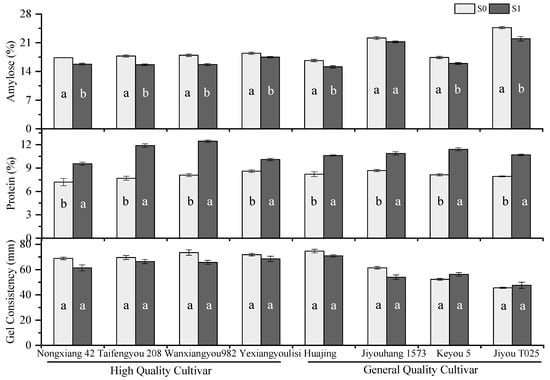 A total of eight rice cultivars cultivated in 2021 were divided into a high-quality group and a general-quality group. There was no interaction between the year and cultivar group for the appearance and milling quality indicators (Table 5). Simulated shading slightly reduced the milled rice recovery of both groups but had no impact on head rice recovery. Simulated shading in 2021 had no effect on grain length or width or the chalkiness of either group, and the variation was mainly associated with the cultivar (Table 5). As for taste quality, shading had no effect on gel consistency in either group (Figure 4), but it significantly increased the protein content. Except for Jiyouhang 1573, the amylose content of the other seven cultivars significantly decreased after shading.