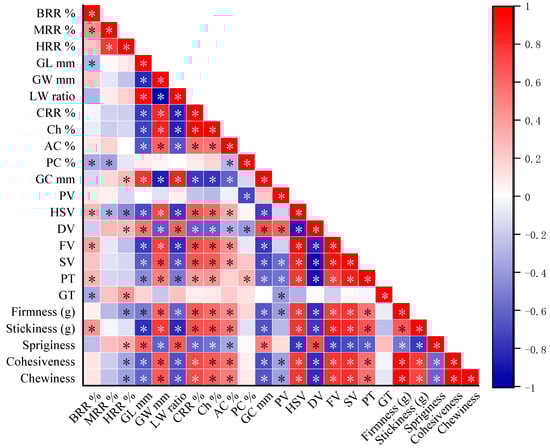 Correlation coefficients among appearance quality, milling quality, RVA spectrum parameters, and textural properties of rice grains. n = 48. * indicate significant difference at p < 0.05 probability level.