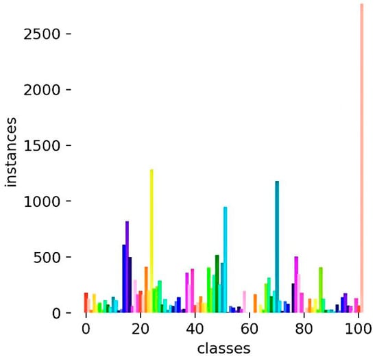 (b). Unbalanced data distribution: Reflecting the actual distribution of pests in the real world, Figure 1 shows the distribution of sample numbers for 102 pest types. It can be seen that there are significant differences in the number of samples of different pest types, for example, the number of samples of category 102 pests is much higher than the number of samples of category 3 pests. This phenomenon of unbalanced sample number leads to poor performance of the model on the pest types with a small number of samples, which increases the difficulty of model training and puts forward higher requirements for the generalization ability of the model.