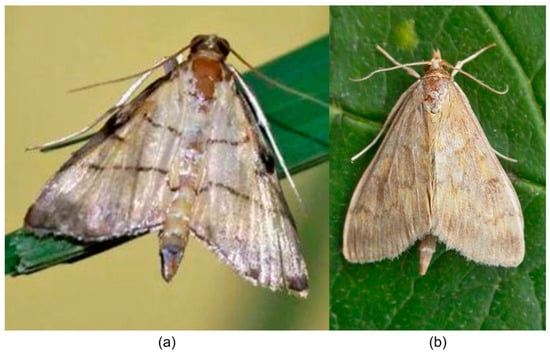 (a) is the rice leaf roller and (b) is the corn borer, both of which are very similar and have high requirements for feature extraction.