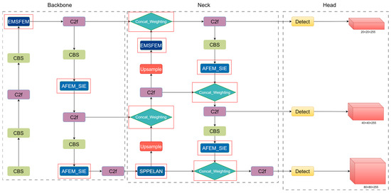 YOLOv8 is the latest version of the YOLO (You Only Look Once) family of target detection algorithms, developed by Ultralytics. The model employs an efficient backbone network to reduce the computational effort and enhances the detection of targets at different scales with feature pyramid network (FPN) and spatial pyramid pooling (SPPF) modules. However, YOLOv8 still has some limitations in specific application scenarios [12,13,14,15], e.g., the detection of large-scale multi-species pests, such as an imbalance of pest categories, reduced recognition accuracy in complex backgrounds, and high similarity of pest appearance features. In order to solve the above problems, we improved the YOLOv8n model by adding the multi-scale feature enhancement module EMSFEM and Feature Enhancement Module for Space Information Exchange AFEM_SIE. The original feature map splicing Concat has been effectively improved; and the original spatial pyramid pooling structure SPPF has been replaced by the more flexible and feature-rich SPPELAN structure. The improved algorithm model structure is shown in Figure 4.