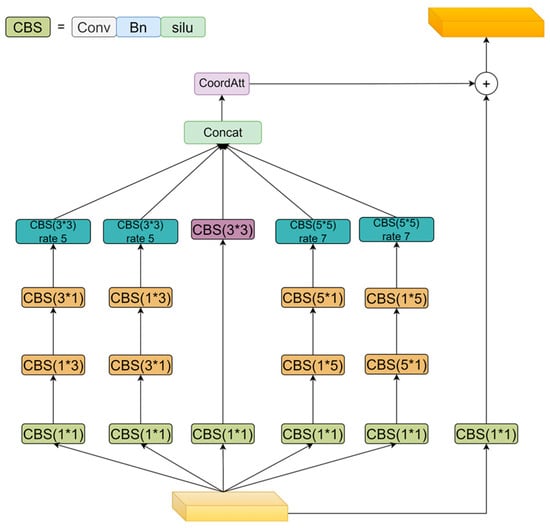 The first and second branches use asymmetric Dilated convolution [17] with the convolution kernel sizes of (1,3) and (3,1), respectively, and the two branches’ convolution in reverse order to capture the horizontal and vertical orientation features, thus effectively extracting the directional features of the target. Both branches also use 3 × 3 Dilated convolution (dilation = 5) to expand the receptive field, allowing for the better extraction of information such as the width, height, texture, and edge of the target.
