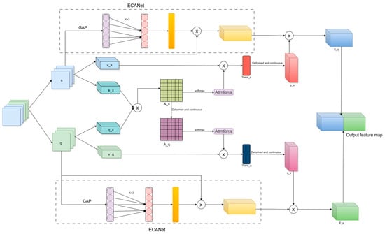 Using the attention weights obtained, the feature graphs are weighted. Specifically, the weighted sum of using the attention weight s gives . Then, is deformed and transposed back to its original shape, and is applied to transform it. Similarly, a weighted summation of using the attentional weight q yields , which is transformed using (self. and self.: define two transform modules for processing branches s and q, each containing a 1 × 1 convolution layer and a batch normalization layer). To further enhance the features, q and s are processed by the ECANet channel attention mechanism. The mechanism uses global average pooling, one-dimensional convolution, and sigmoid functions to calculate the weight of each channel, thereby enhancing important channels and suppressing unimportant ones. The channel attention weights were multiplied by and , and the results were added to p and s, respectively, to obtain the enhanced feature graphs and . Finally, and are spliced together according to channel dimension to obtain the final output feature map after feature enhancement.
