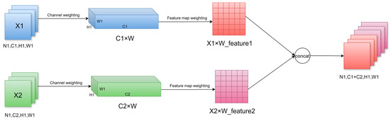 Feature fusion is an important research topic in deep learning, and its goal is to combine features from different sources or different levels effectively to improve the expressiveness and generalization performance of the model [23]. Traditional feature fusion methods, simply splicing features in the specified dimension, lack the ability of learning and feature selection. This results in the inability of the model to learn the best feature fusion method based on the data, thus limiting the performance of the model. To solve this problem, we use Concat_Weighting. This module uses learned weights to channel and map input features to achieve more flexible and efficient feature fusion. The overall structure of the Concat_Weighting module is shown in Figure 7.