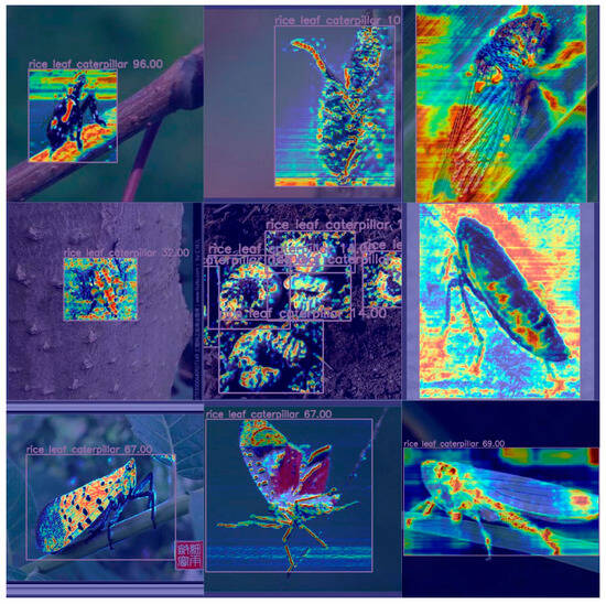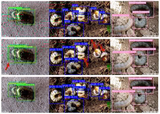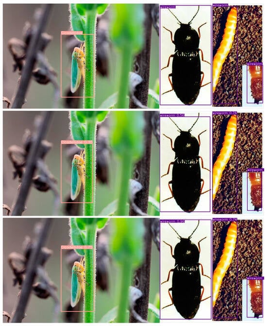As shown in Figure 14, the improved model is much better at detecting pests of different species but similar in appearance. The pests shown in the figure belong to different species but are extremely similar in appearance, posing a great challenge to the model’s ability to detect them.