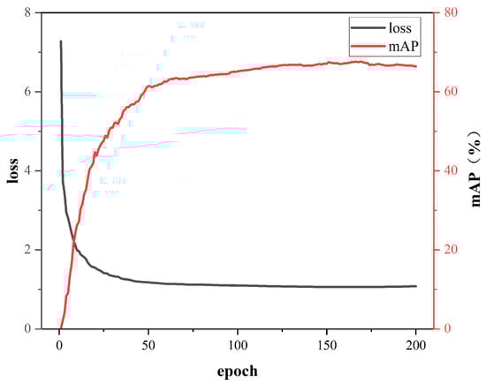 Figure 11 shows the change trend of the loss function value and mAP during model training. At the beginning of training, the model has a high learning rate, and the loss function value decreases rapidly in the first 20 epochs. As the training progresses, the rate of decline of the loss function value gradually slows down, and it eventually stabilizes around epoch 200 and fluctuates around 1.07. At the same time, the mAP rose rapidly over the first 50 epochs before gradually leveling off and eventually fluctuating around 67.1%.