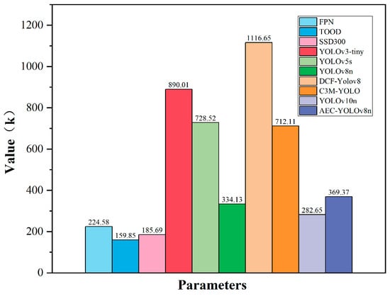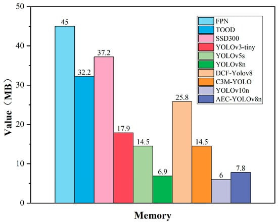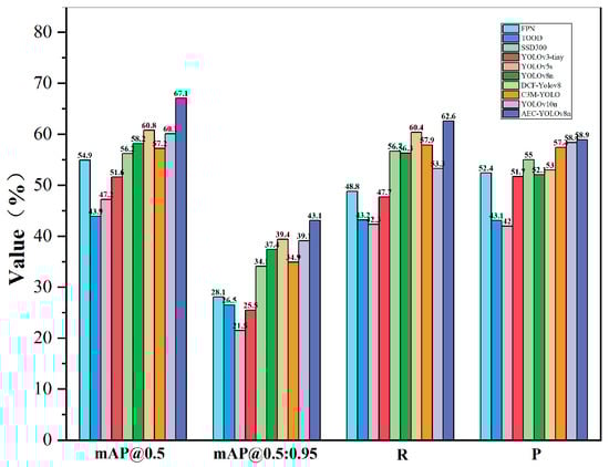 Using the IP102 pest dataset, we compared the AEC-YOLOv8n model to the classical target detection model to validate its advantages in large pest detection tasks. Figure 15, Figure 16, Figure 17 and Figure 18 show the comparison results of different target detection models, including FPN [25], TOOD [26], SSD300 [27], YOLOv3-tiny [28], YOLOv5s, YOLOv8n, DCF-Yolov8 [29], C3M-YOLO [30], YOLOv10n [31], and AEC-YOLOv8n (ours). Compared with YOLOv8n, the detection indexes of AEC-YOLOv8n were significantly improved, with MAP0.5–0.95 increased by 5.7% and mAP0.5 increased by 8.9%. Our algorithm shows the best performance in mAP50 and MAP50–95. This excellent performance is due to our proposed EMSFEM and AFEM_SIE module. The EMSFEM is better at extracting fine details, while the AFEM_SIE module is better at capturing similarities and differences between features. Through the synergistic effect of the two, we enhance the difference of similar features and help the model better understand the global context information of the image, so as to improve the model’s understanding ability of the image. On the IP102 dataset, our model shows a higher precision and generalization ability than the other models.