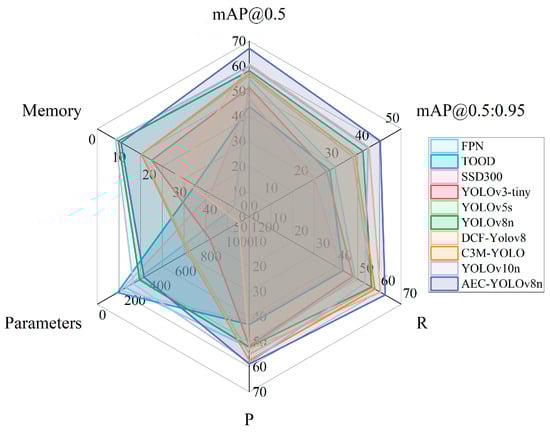 Comprehensive performance comparison of 10 detection algorithms, the closer the intersection of each curve and each axis is to the outside, the better the index. The larger the area enclosed by the curve, the better the overall performance of the algorithm.