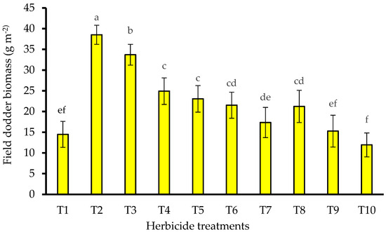 The effect of different herbicide treatments on field dodder biomass at second cutting of alfalfa. T1: imazethapyr at 100 g a.i. ha−1 + cytogate surfactant 0.5 vv−1, T2: glyphosate at 143 g a.i. ha−1 + ammonium sulfate at 8 kg ha−1, T3: glyphosate at 184 g a.i. ha−1 + ammonium sulfate at 8 kg ha−1, T4: glyphosate at 225 g a.i. ha−1 + ammonium sulfate at 8 kg ha−1, T5: glyphosate at 266 g a.i. ha−1 + ammonium sulfate at 8 kg ha−1, T6: glyphosate at 307 g a.i. ha−1 + ammonium sulfate at 8 kg ha−1, T7: glyphosate at 348 g a.i. ha−1 + ammonium sulfate at 8 kg ha−1, T8: propyzamide at 1250 g a.i. ha−1, T9: propyzamide at 1500 g a.i. ha−1 and T10: propyzamide at 1750 g a.i. ha−1. Error bars show the standard errors of the means. Main data bars with different letters were significantly different. LSD (p < 0.05) = 4.18.