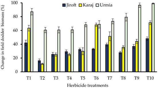 The interaction effect of different herbicide × location on percentage change in field dodder biomass at first cutting of alfalfa. T1: imazethapyr at 100 g a.i. ha−1 + cytogate surfactant 0.5 vv−1, T2: glyphosate at 143 g a.i. ha−1 + ammonium sulfate at 8 kg ha−1, T3: glyphosate at 184 g a.i. ha−1 + ammonium sulfate at 8 kg ha−1, T4: glyphosate at 225 g a.i. ha−1 + ammonium sulfate at 8 kg ha−1, T5: glyphosate at 266 g a.i. ha−1 + ammonium sulfate at 8 kg ha−1, T6: glyphosate at 307 g a.i. ha−1 + ammonium sulfate at 8 kg ha−1, T7: glyphosate at 348 g a.i. ha−1 + ammonium sulfate at 8 kg ha−1, T8: propyzamide at 1250 g a.i. ha−1, T9: propyzamide at 1500 g a.i. ha−1 and T10: propyzamide at 1750 g a.i. ha−1. Error bars show the standard errors of the means. LSD (p < 0.05) = 10.42.