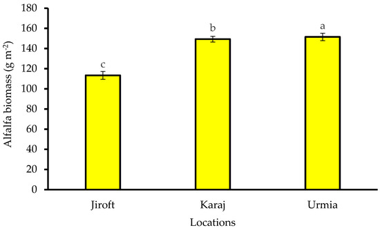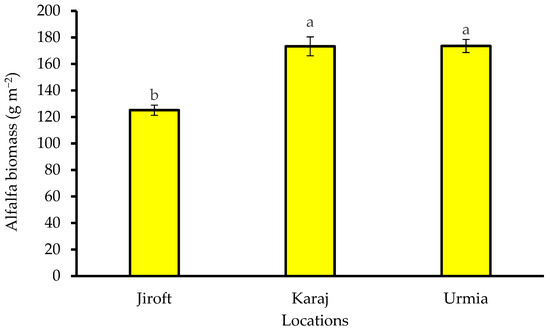 The alfalfa biomass at three different locations at the first cutting of alfalfa. Error bars show the standard errors of the means. Main data bars with different letters were significantly different. LSD (p < 0.05) = 0.62.