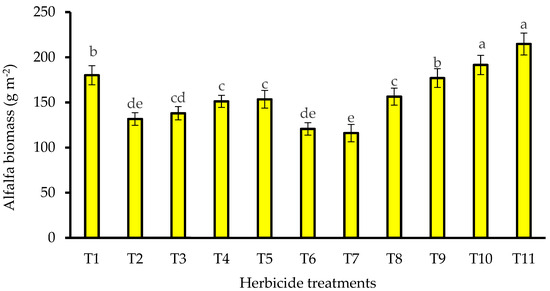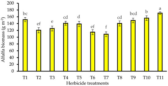 The effect of different herbicide treatments on alfalfa biomass at the first cutting of alfalfa. T1: imazethapyr at 100 g a.i. ha−1 + cytogate surfactant 0.5 vv−1, T2: glyphosate at 143 g a.i. ha−1 + ammonium sulfate at 8 kg ha−1, T3: glyphosate at 184 g a.i. ha−1 + ammonium sulfate at 8 kg ha−1, T4: glyphosate at 225 g a.i. ha−1 + ammonium sulfate at 8 kg ha−1, T5: glyphosate at 266 g a.i. ha−1 + ammonium sulfate at 8 kg ha−1, T6: glyphosate at 307 g a.i. ha−1 + ammonium sulfate at 8 kg ha−1, T7: glyphosate at 348 g a.i. ha−1 + ammonium sulfate at 8 kg ha−1, T8: propyzamide at 1250 g a.i. ha−1, T9: propyzamide at 1500 g a.i. ha−1, T10: propyzamide at 1750 g a.i. ha−1, and T11: weed free. Error bars show the standard errors of the means. Main data bars with different letters were significantly different. LSD (p < 0.05) = 12.56.