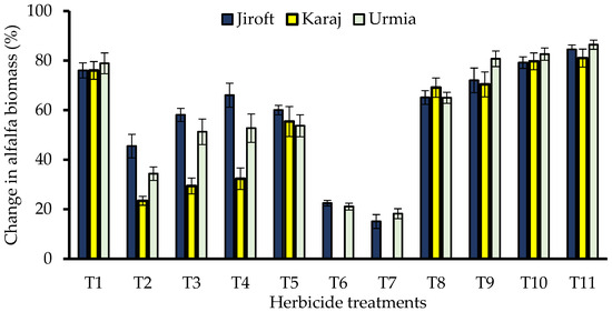 The interactive effect of the herbicide treatments and the locations on percentage improvement in alfalfa biomass at the first cutting of alfalfa. T1: imazethapyr at 100 g a.i. ha−1 + cytogate surfactant 0.5 vv−1, T2: glyphosate at 143 g a.i. ha−1 + ammonium sulfate at 8 kg ha−1, T3: glyphosate at 184 g a.i. ha−1 + ammonium sulfate at 8 kg ha−1, T4: glyphosate at 225 g a.i. ha−1 + ammonium sulfate at 8 kg ha−1, T5: glyphosate at 266 g a.i. ha−1 + ammonium sulfate at 8 kg ha−1, T6: glyphosate at 307 g a.i. ha−1 + ammonium sulfate at 8 kg ha−1, T7: glyphosate at 348 g a.i. ha−1 + ammonium sulfate at 8 kg ha−1, T8: propyzamide at 1250 g a.i. ha−1, T9: propyzamide at 1500 g a.i. ha−1, T10: propyzamide at 1750 g a.i. ha−1, and T11: weed free. Error bars show the standard errors of the means. LSD (p < 0.05) = 9.74.