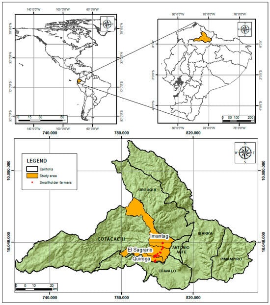 This research was conducted in three administrative zones: Imantag, El Sagrario, and Quiroga (Figure 1) in the Andes Highlands (altitude >2500 m.a.s.l.) of Cotacachi Canton. It is located in the north of Ecuador, approximately 100 km from the capital, Quito.