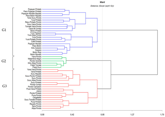 The cophenetic correlation coefficient of 0.6 in the cluster analysis indicates reasonably well-defined clusters based on the morphological seed traits within the three groups (Figure 3). The landraces in G1 were the most abundant (22), and their seeds showed the largest dimensions of all the groups, exhibiting an oval shape and mainly white seed primary color with no pattern. The seeds in G2 represented the smallest group (six landraces) and showed the shortest length and width dimensions, pale cream to buff primary color generally without a pattern, and most of the seeds were kidney-shaped. The seeds in G3 included 19 landraces and presented the lowest thickness of all the groups, the main seed primary color was pale cream to buff, and most of the accessions showed a striped pattern (with black as the principal secondary color) and kidney shape. These results could lead to selecting landraces for future breeding programs to obtain desirable characteristics based on the consumer preferences.