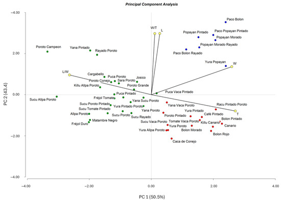 Principal component analysis showed that 94% of the variation was explained by PC1 and PC2 (Figure 4 and Table 4). The first principal component (PC1) explained the highest percentage of variance (51%), and it was correlated with seed thickness (T) and the ratio L/W. The second principal component (PC2) justified 43% of the variation and was highly correlated with the seed length (L) and the ratio W/T. Most of the landraces of G1 were located on the right side of the plot (red circles). The P. coccineus landraces were concentrated in the upper right quadrant (blue circles), exhibiting a distinct boundary from the other groups. Landraces from G2 and G3 were placed on the left side of the plot (green circles). There were also outliers in the group, represented by landraces Poroto Campeon, Sucu Allpa Poroto, Yana Pintado, and Rayado Poroto.