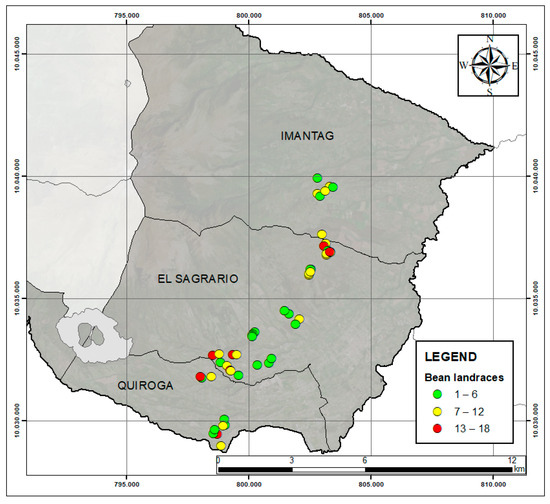 As shown in Figure 5, we found bean landraces distributed in the three administrative zones. The number of landraces in each chakra ranged from 1 to 6 (26%), 7 to 12 (24%), and 13 to 18 (8%).