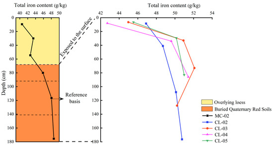 Through the soil reconstruction model, the cumulative changes and migrations of different forms of iron in exposed Quaternary red soils were further calculated and compared with buried Quaternary red soil. The results showed that the cumulative changes in total iron (Figure 12), free iron, poorly crystalline iron oxides, and crystalline oxides in the CL-04 profile were the highest, which were 26.84 g/100 cm2, 27.93 g/100 cm2, 2.55 g/100 cm2, and 26.48 g/100 cm2, respectively. The cumulative change in the silicate-bonded iron pool in CL-02 was the largest, at 15.99 g/100 cm2.