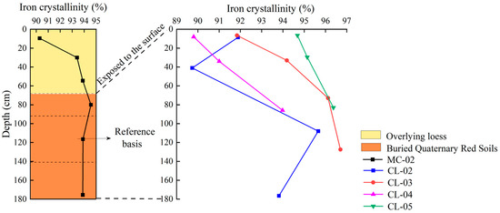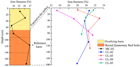 In summary, compared with buried Quaternary red soil, the exposed Quaternary red soils demonstrated increased iron freeness and crystallinity. However, iron activity decreased in grassland and cultivated land due to the significant conversion of poorly crystalline iron oxides into crystalline oxides (0.31 g/100 cm3 in woodland vs. 0.24 g/100 cm3 in cultivated land).