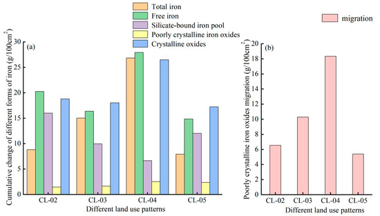 Cumulative changes and migrations of iron in different forms in Quaternary red soils: (a) cumulative variation of iron in different forms in Quaternary red soils; (b) migration of poorly crystalline iron oxides in Quaternary red soils.